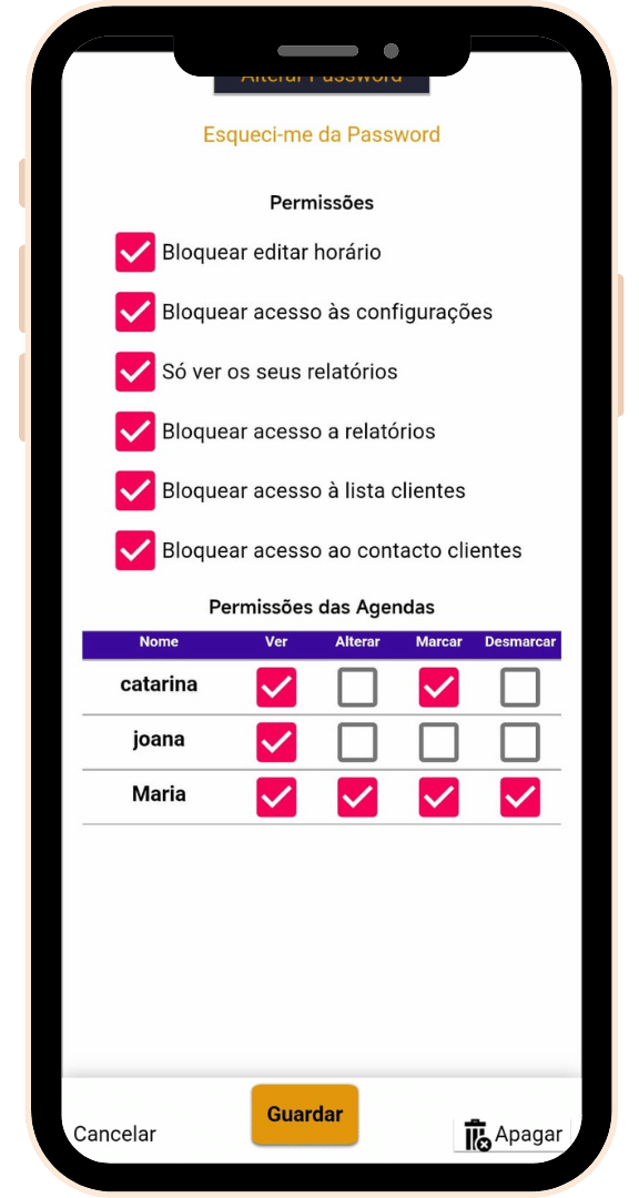 Pode escolher quais agendas o funcionário pode ver e se pode fazer marcações ou desmarcações ou se é só de consulta sem poder mecher nas marcações